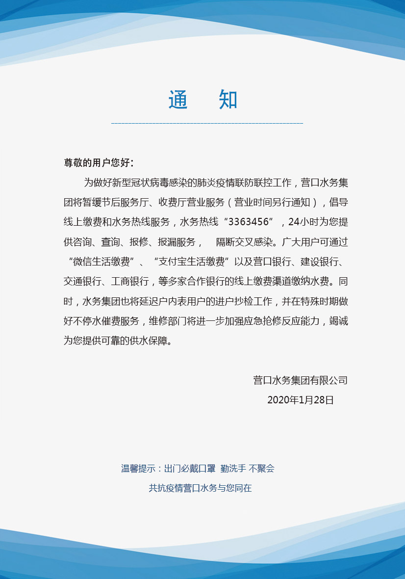 營口水務(wù)集團(tuán)關(guān)于暫緩節(jié)后服務(wù)廳、收費(fèi)廳營業(yè)服務(wù)的通知